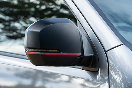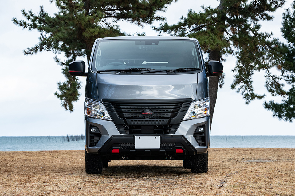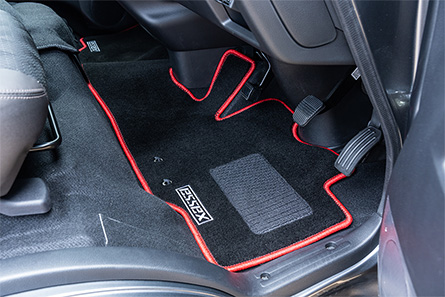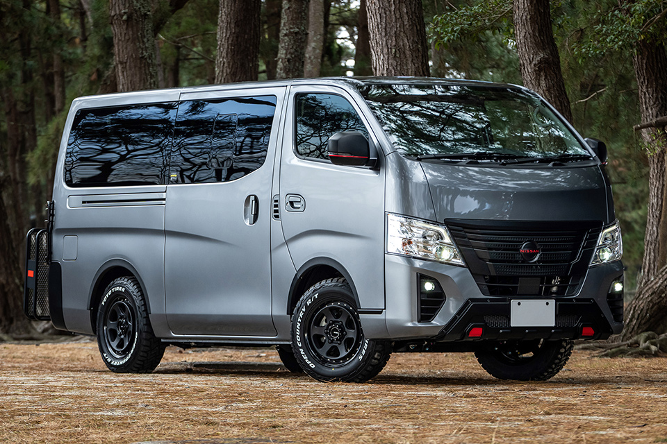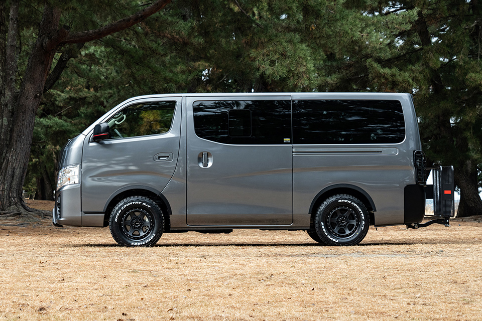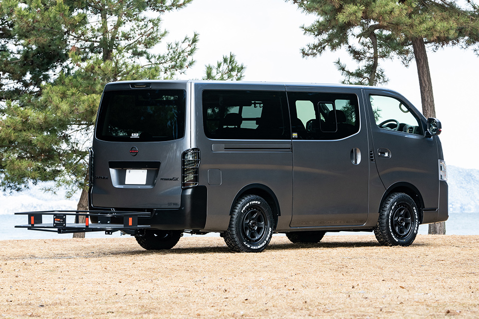 ディテーリングとしては、人気の"赤フチ"ESSEXフロアマットも装備。そのカラーリングに合わせ、New日産キャラバンでリファインされたドアミラーにもレッドラインをカスタムであしらっています。