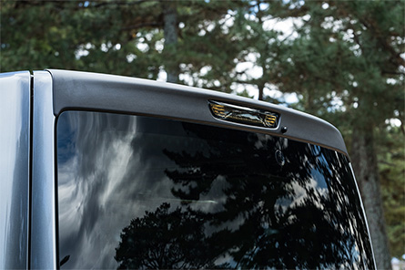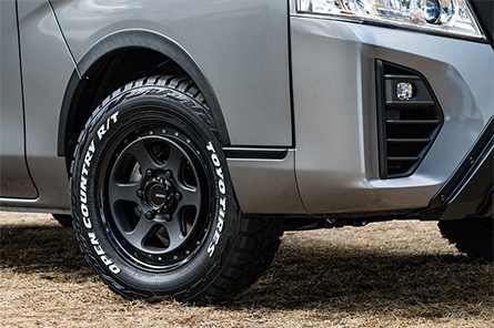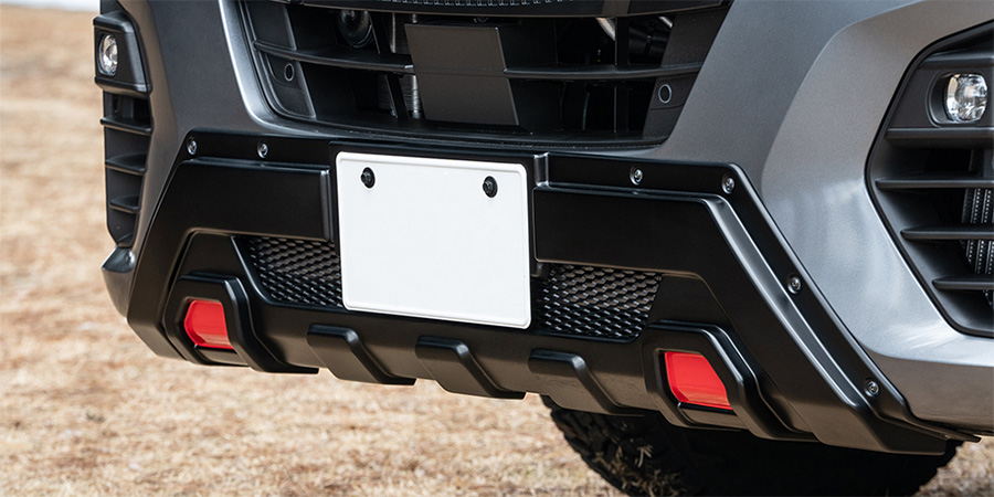 今回一番のこだわりアイテムはバンパーガード。北米系ピックアップトラックをイメージしノーマル車高、アゲ系だけでなくサゲ系に合うようにと開発。足元にはディスク部がマット、リム部がグロスで塗り分けた2ピース「ESSEX EL」に、出幅6㎜のオーバーフェンダー&TOYOオープンカントリーを。リアゲートにフィットするスポイラーも自慢のアイテムです。