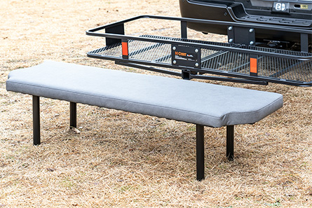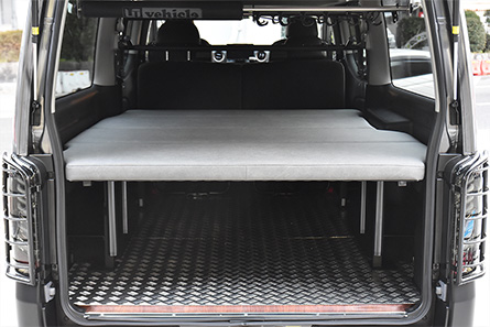 「こんなのがあったらいいな」を形にした新商品のベッドマット。車室内ではベッドとして、車外での使用時にはベンチチェアにもなるユニークアイテム。フロアには人気商品アルミステップから派生した「アルミフロアパネル」を新開発。バイクなど重装備のトランポとしても耐用します。
