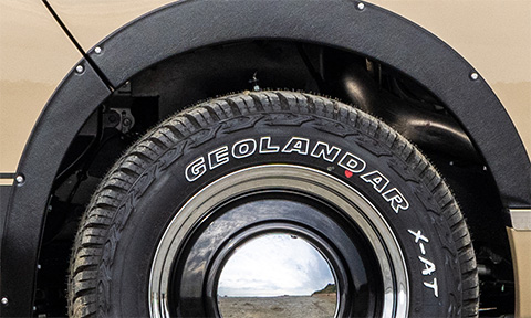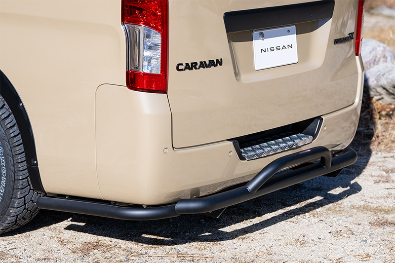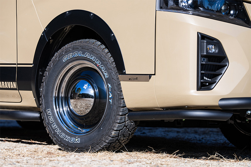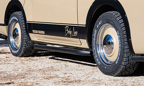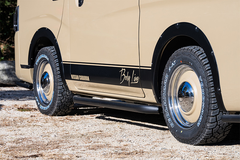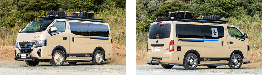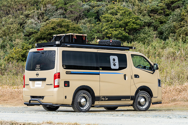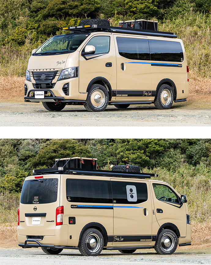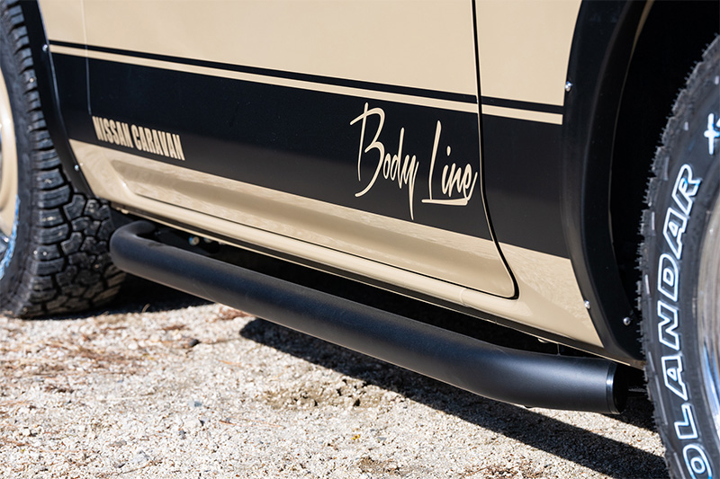 サイドには初代キャラバン・コーチのオプションデカールをイメージしたスカイブルデザインのオリジナルサイドデカールを配置しレトロ風情を漂わす。