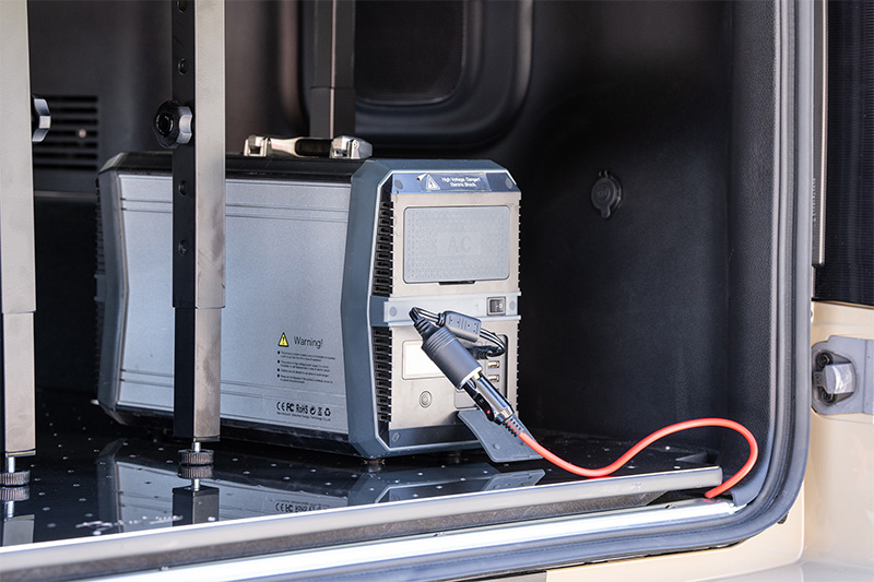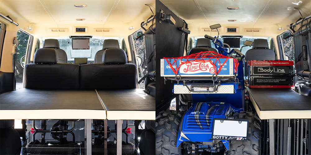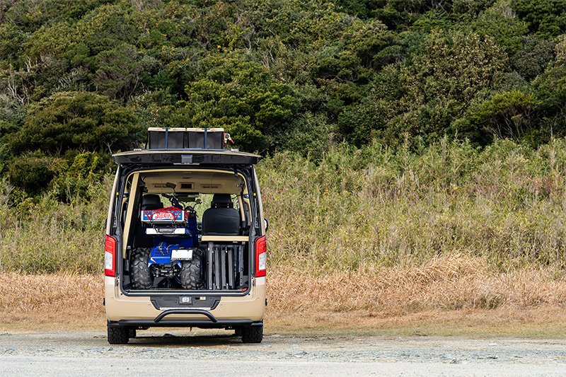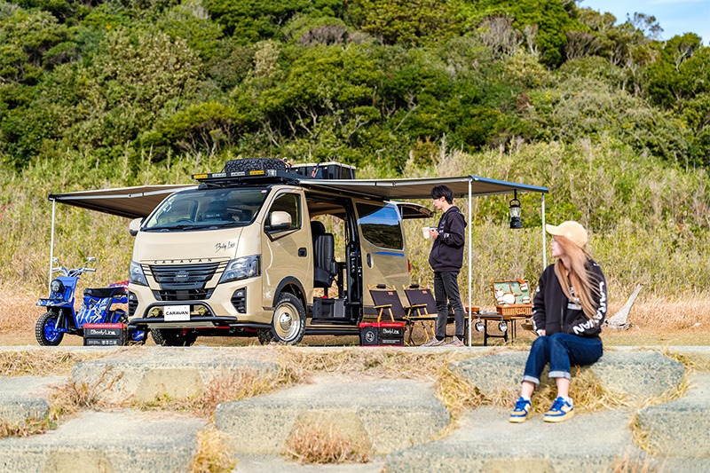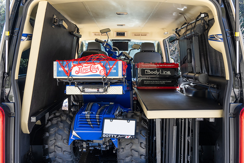 6:4分割のベッドキットを備えたキャラバンにトライクも積み込んだ、アウトドアを満喫できる仕様。