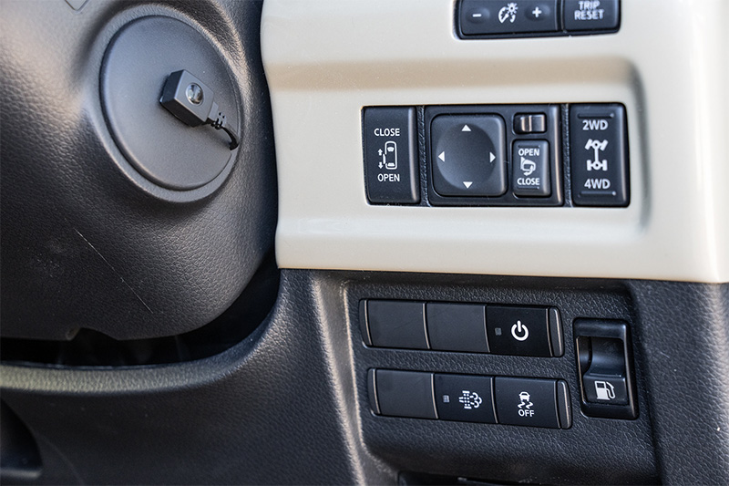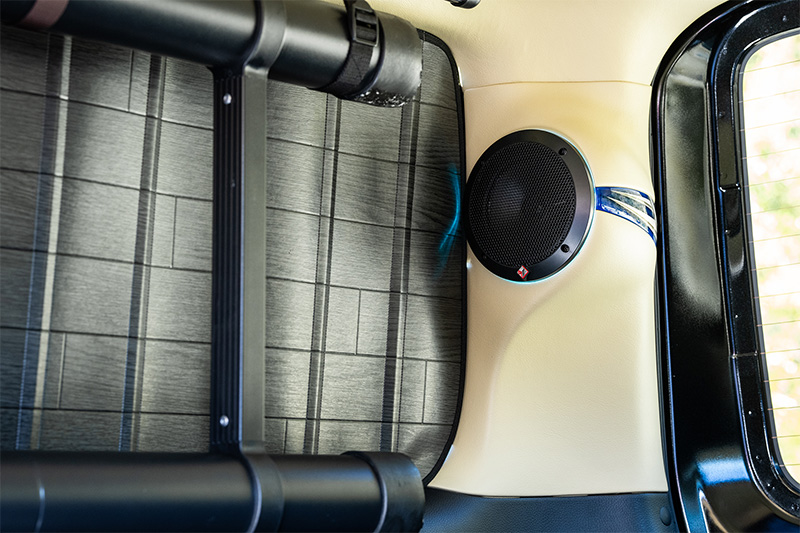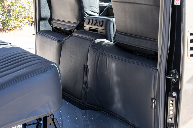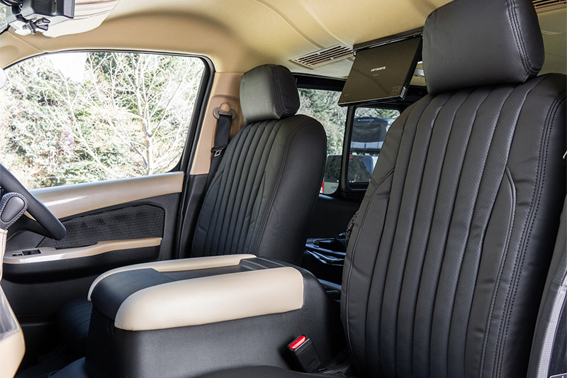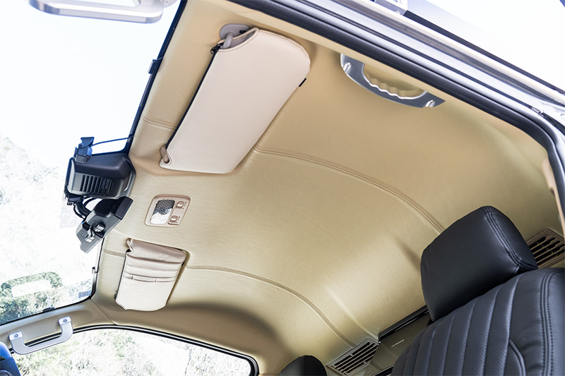 天井レザーやベッドキットのサイド、ドリンクホルダー付きのセンターコンソールも車体色に合わせた色で統一感を持たせている。