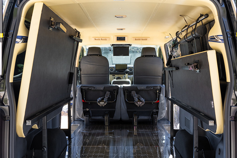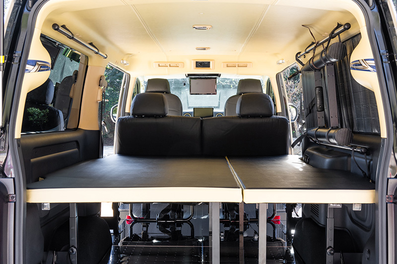 内装は6:4で左右に分割且つ、上下可動もOKな跳ね上げベッドキットを搭載。