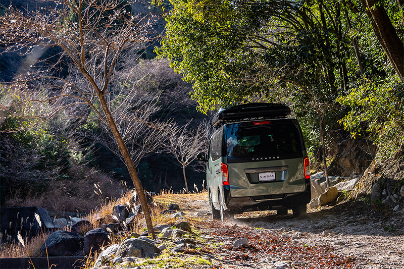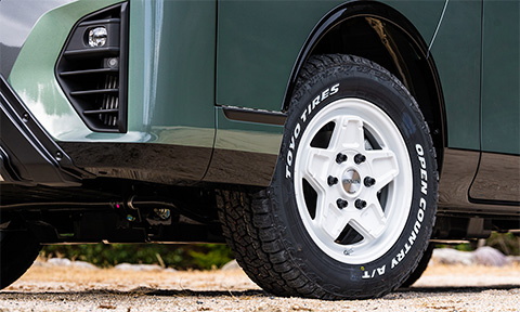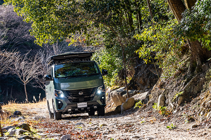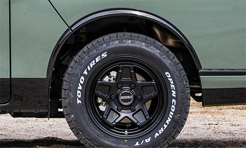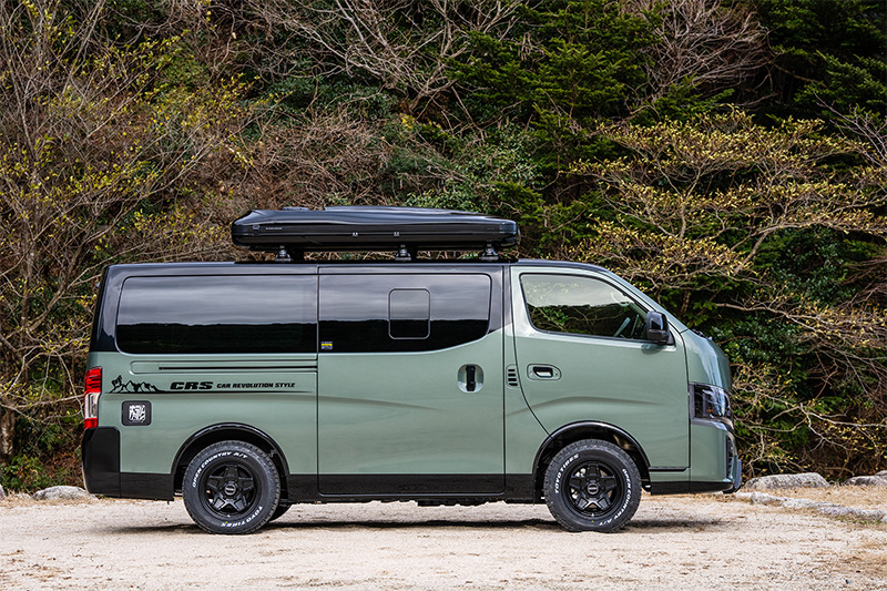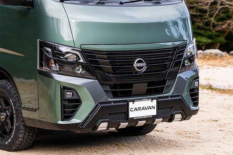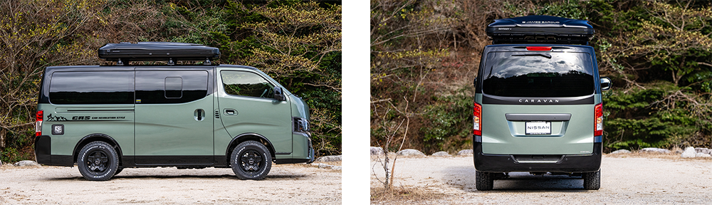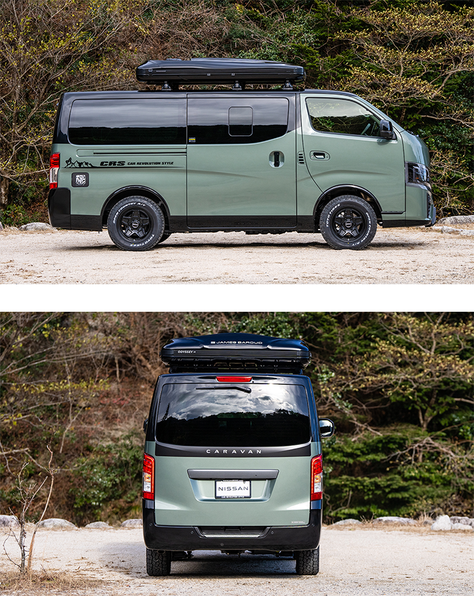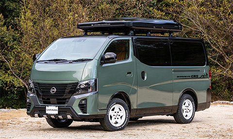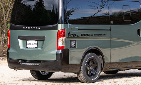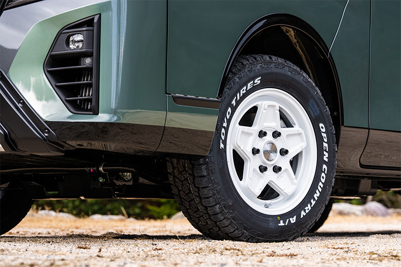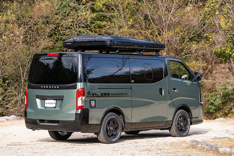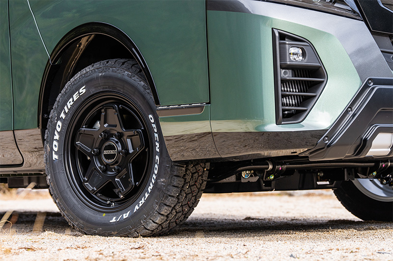 新作のキャラバン専用ホイールとオフロードタイヤで4WD感を高めつつ、アッシュグリーンメタリックの全塗装と、