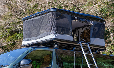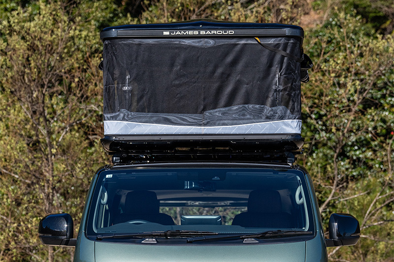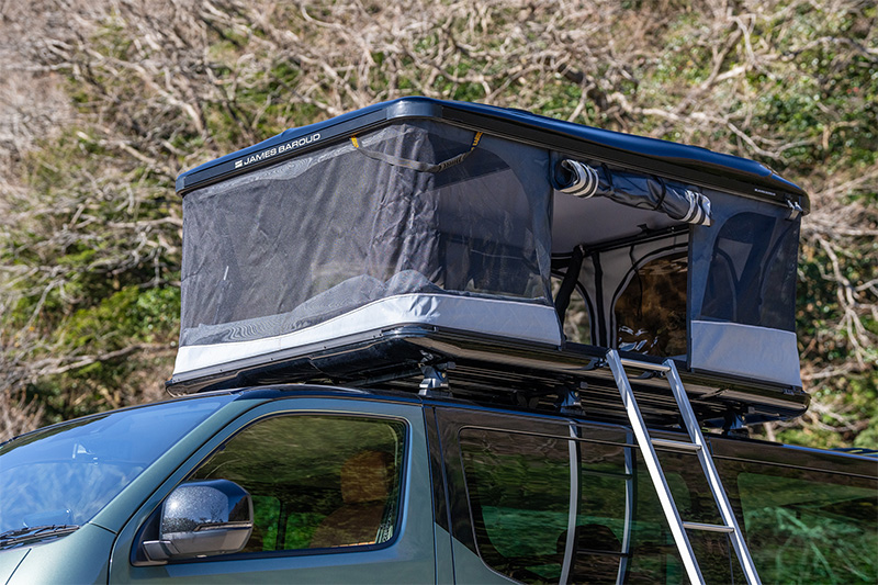 ルーフキャリアに、ジェームスバロウド製のハードシェルテントを積載。