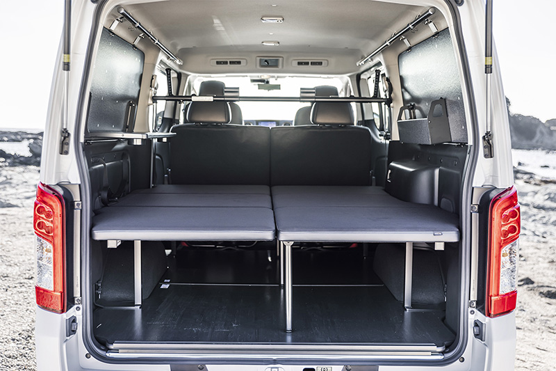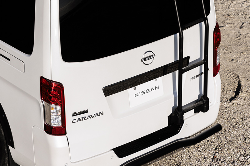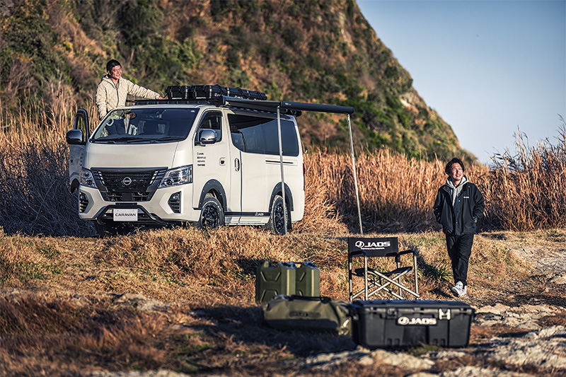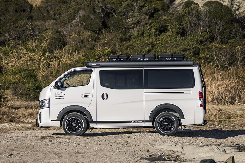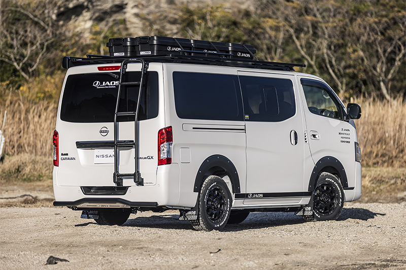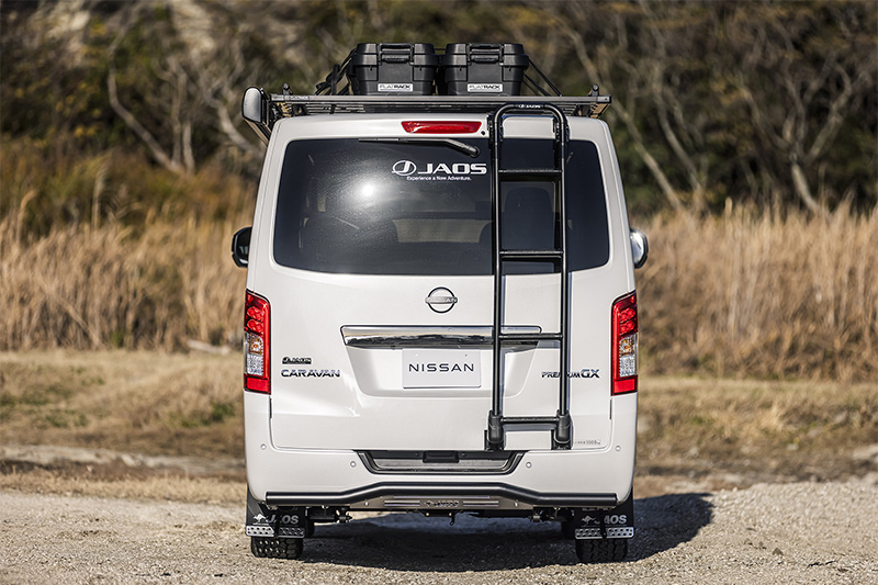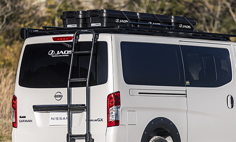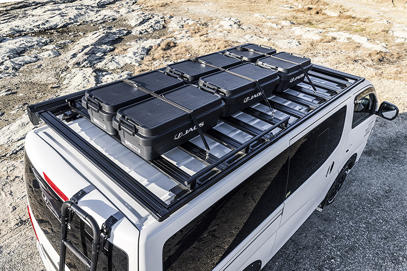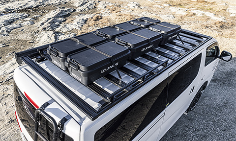 キャラバンに標準装備されている純正ルーフナットを活用してより低く、より高面積に装着できるルーフキャリア(フラットラック)は、用途に合わせたアレンジが可能。