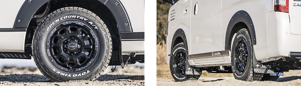 キャラバン専用オフセットとして新設定されたホイールはマットブラックポリッシュの16インチ。