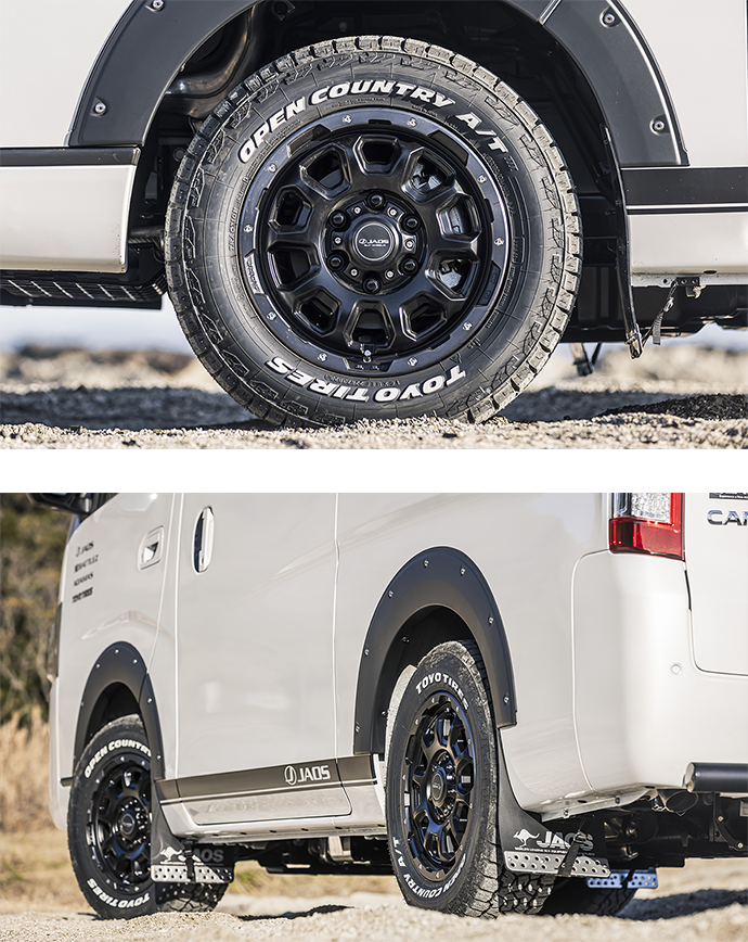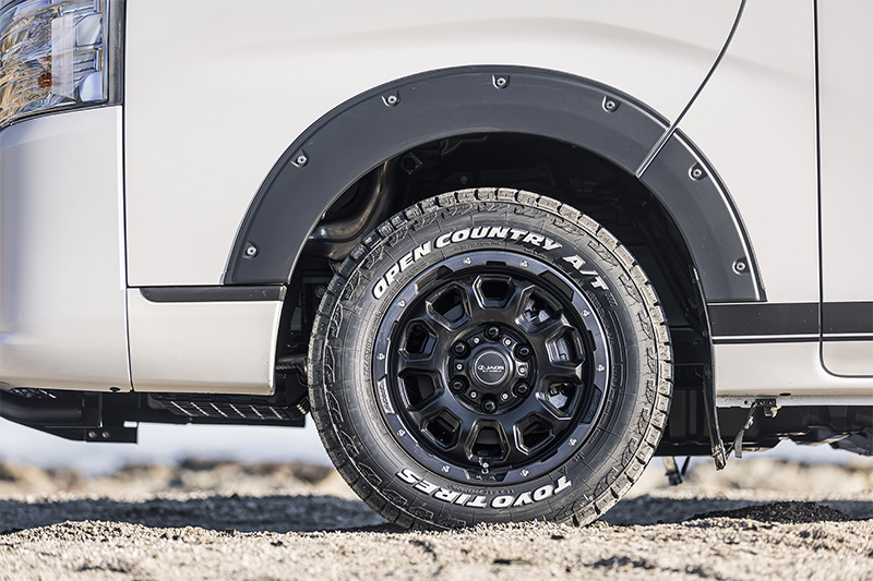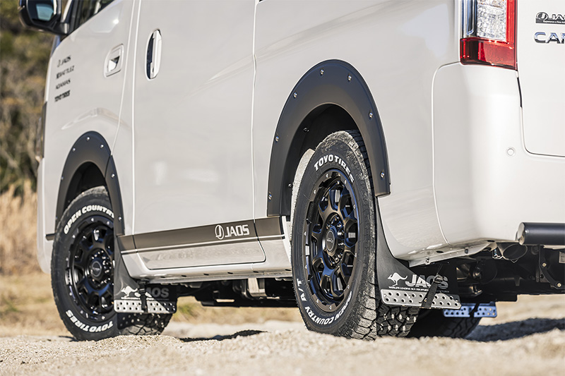 ボルト留め風のフェンダーガーニッシュは、片側厚さ9ミリの薄型設計で、キャラバン専用外(ハイエース)オフセットでも車検対応できるよう設計されている。
