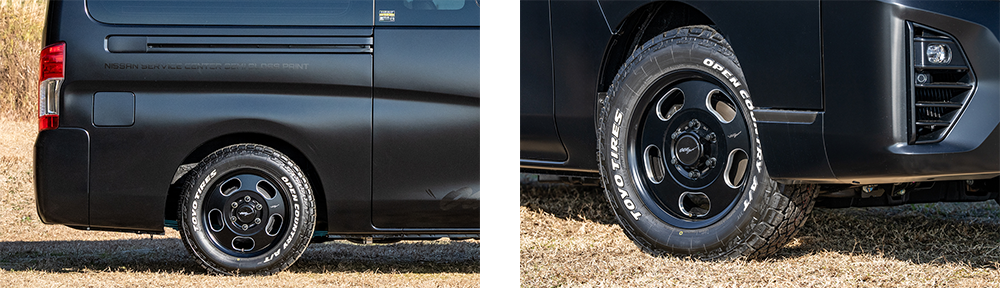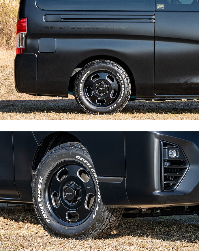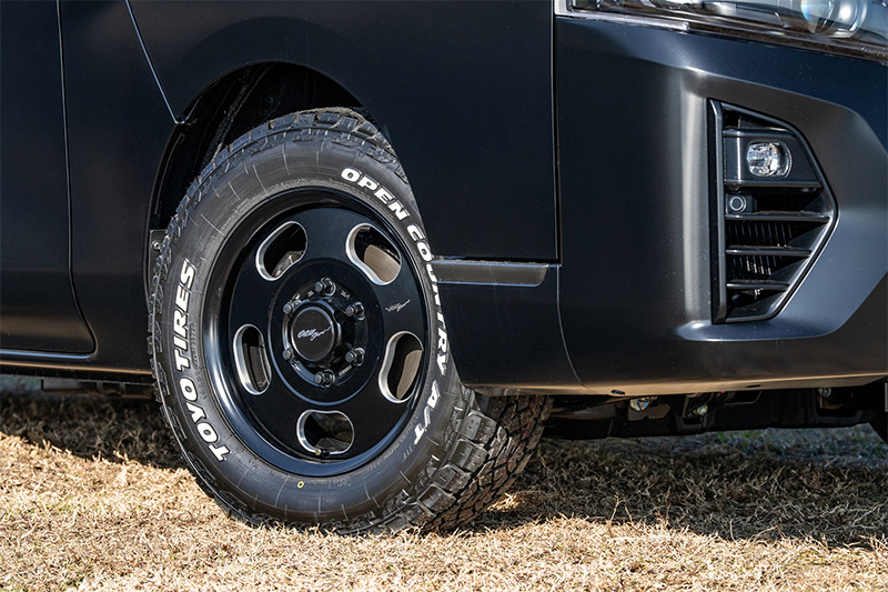 ホイールメーカー「EMC」とオグショーがコラボした2ピース鍛造ホイール「Frontline SFW Ⅲ OGUshow Ver 16 × 6.5J IN45)」とオープンカントリー A/ TⅢ 215/65R16で足元を武装。ホイールカラーはオグショー 限定モデル のセミグロスブラックポリッシュ を選択。