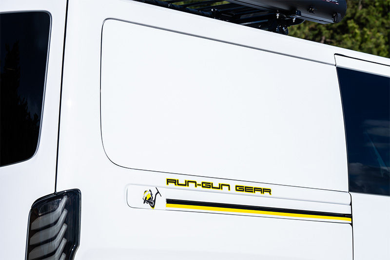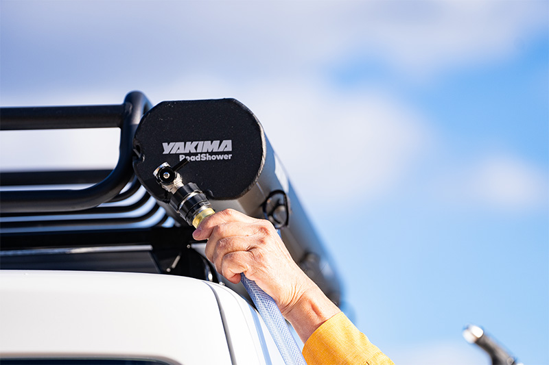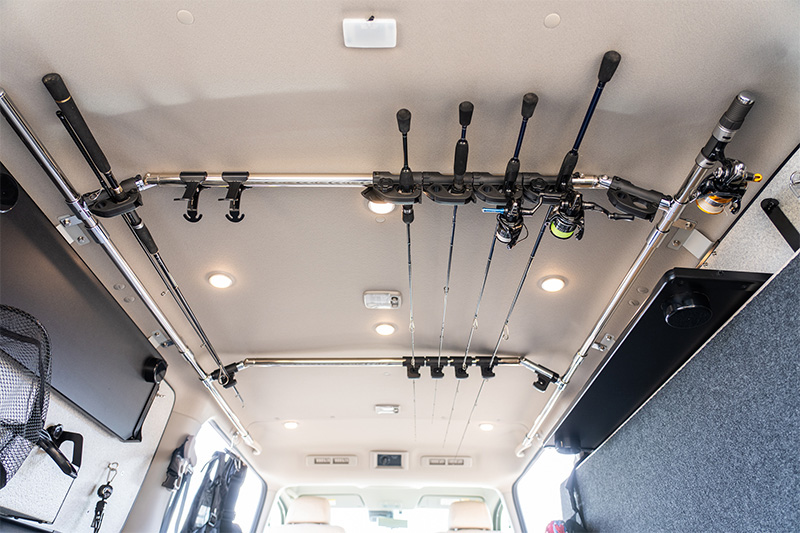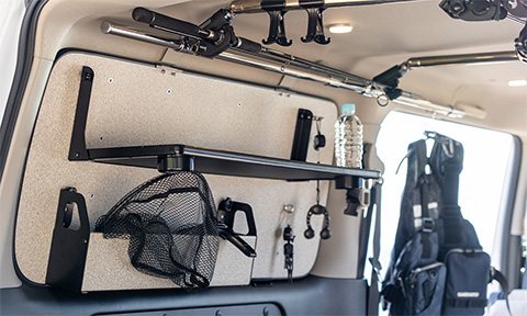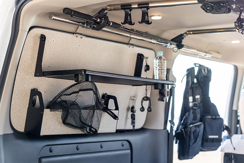 実際の釣り仲間と考案した内装の使い勝手やギアのメンテナンスを考えて、簡易シャワーを搭載。