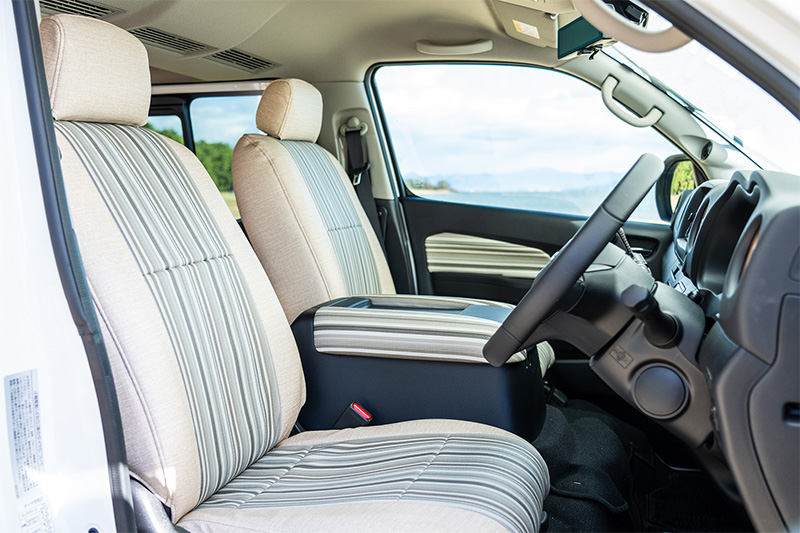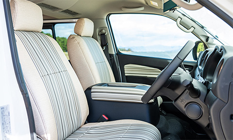 好評の内装レイアウトはそのままに新カラーにアップデート。ベッド生地をフロントドア内張りやコンソールにも採用し、統一感を持たせている。