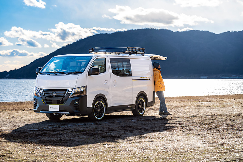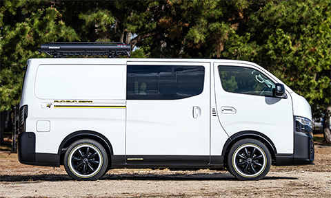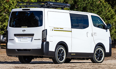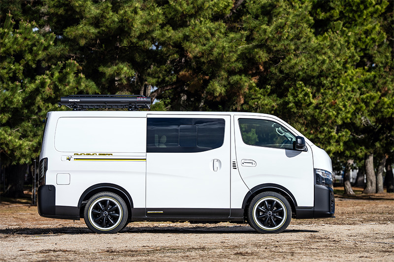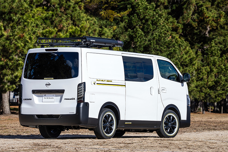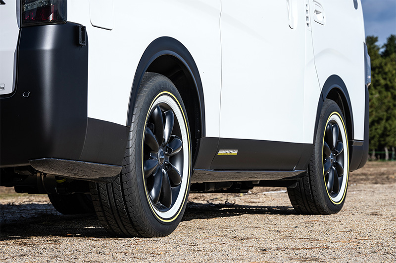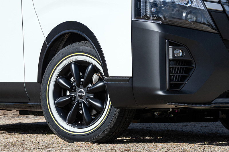 ホイールは同社オリジナルのキャラバンオフセット。リアクオーターガラスはボディ同色のホワイトシート貼りでパネルバン風に。