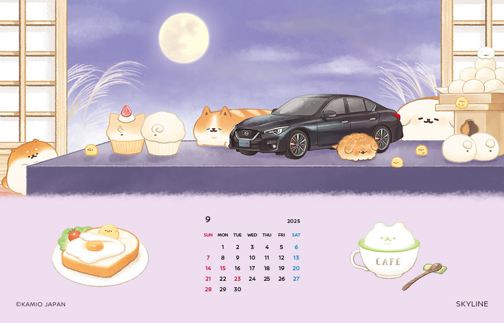 夜空を思わせるスカイラインといっしょに、お月見を楽しむ“しばこっぺ”。もしかしてお月見だんごをねらっている?