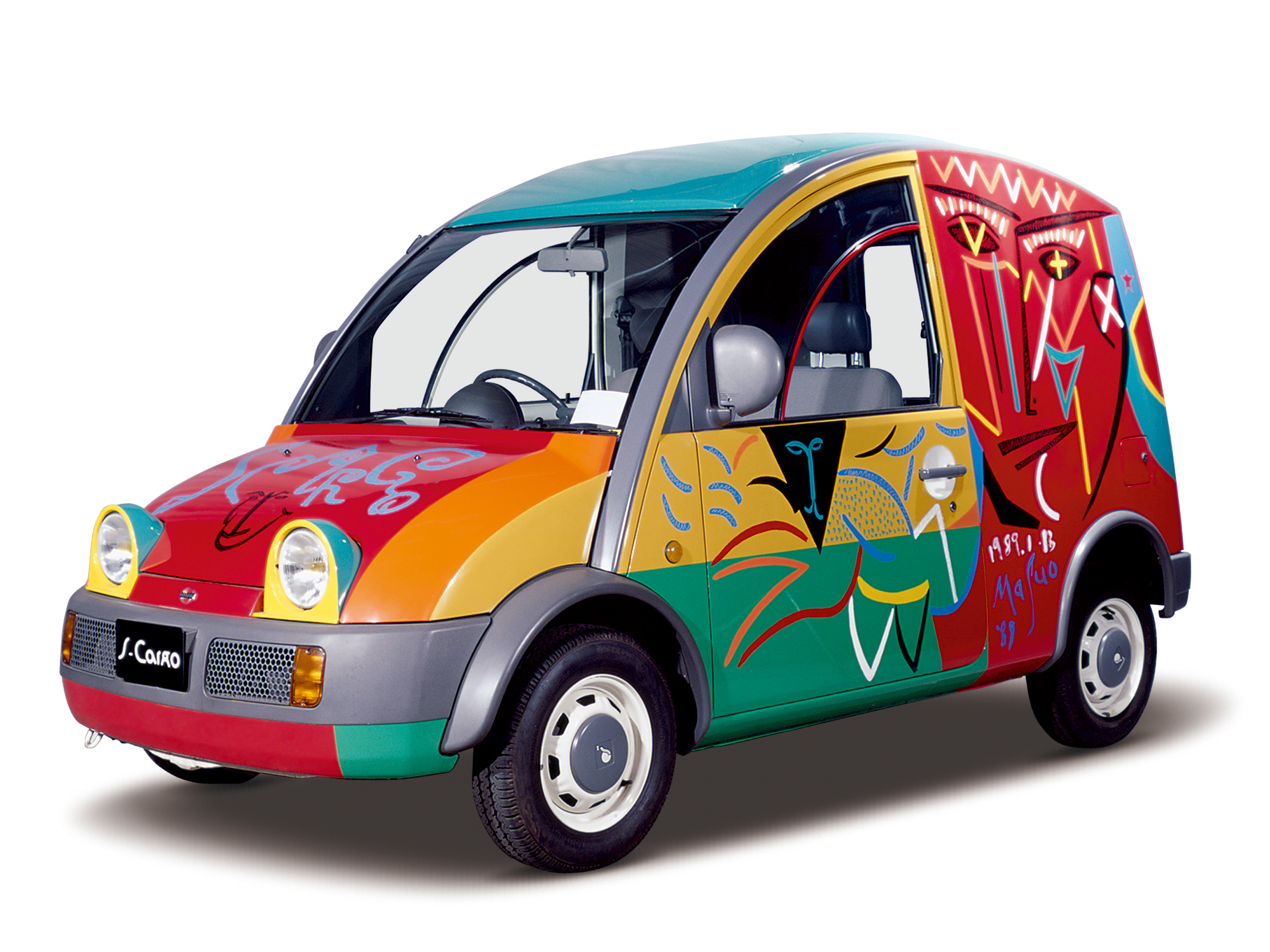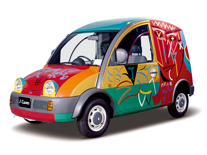 第26回(1985年)東京モーターショーでデビューしたBe-1に続き、日産自動車では第27回(1987年)東京モーターショーでも話題作を出品しました。そのひとつがS-Cargo(エスカルゴ)で、1989年(平成元年)1月に発売されました。車種名のように、どことなくエスカルゴ(カタツムリ)を思わせるエクステリアデザインは、遊び心やかわいさはもちろん、商用車としての実用性を両立させていました。エンジンの排気量は1500ccで、トランスミッションは3速ATとの組み合わせとなりました。標準ルーフのほか、キャンバストップもラインアップされました。このクルマは、彫刻から映画監督まで幅広い芸術活動を展開した池田満寿夫氏(1934~97年)によるカラーリングの特別な1台です。