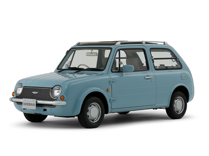 Be-1(1987 年発売)に続いて登場した日産の「パイクカー」シリーズの第2 弾がこのPAO(パオ)です。パイクカーとは、少量生産を前提とした遊び心のある「尖った(鋭い)」感覚のクルマの総称でした。PAO は1987 年の東京モーターショーにコンセプトカーとして出展後、1989 年(平成元年)1 月に発売されましたが、Be-1 とは異なり、3 ヶ月間予約を受けた後に全数を生産・納車するという手法が採用されました。その結果、総生産台数は3 万台あまりに上ります。車両のベースは引き続きマーチ(K10 型)ですが、内外装ともに「冒険心」をテーマにしたレトロ調の内外装で大人気を博しました。車名は中国語の包(パオ)に由来し、モンゴルの遊牧民の「組立式家屋」を意味しています。このクルマはキャンバストップ仕様です。