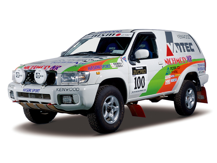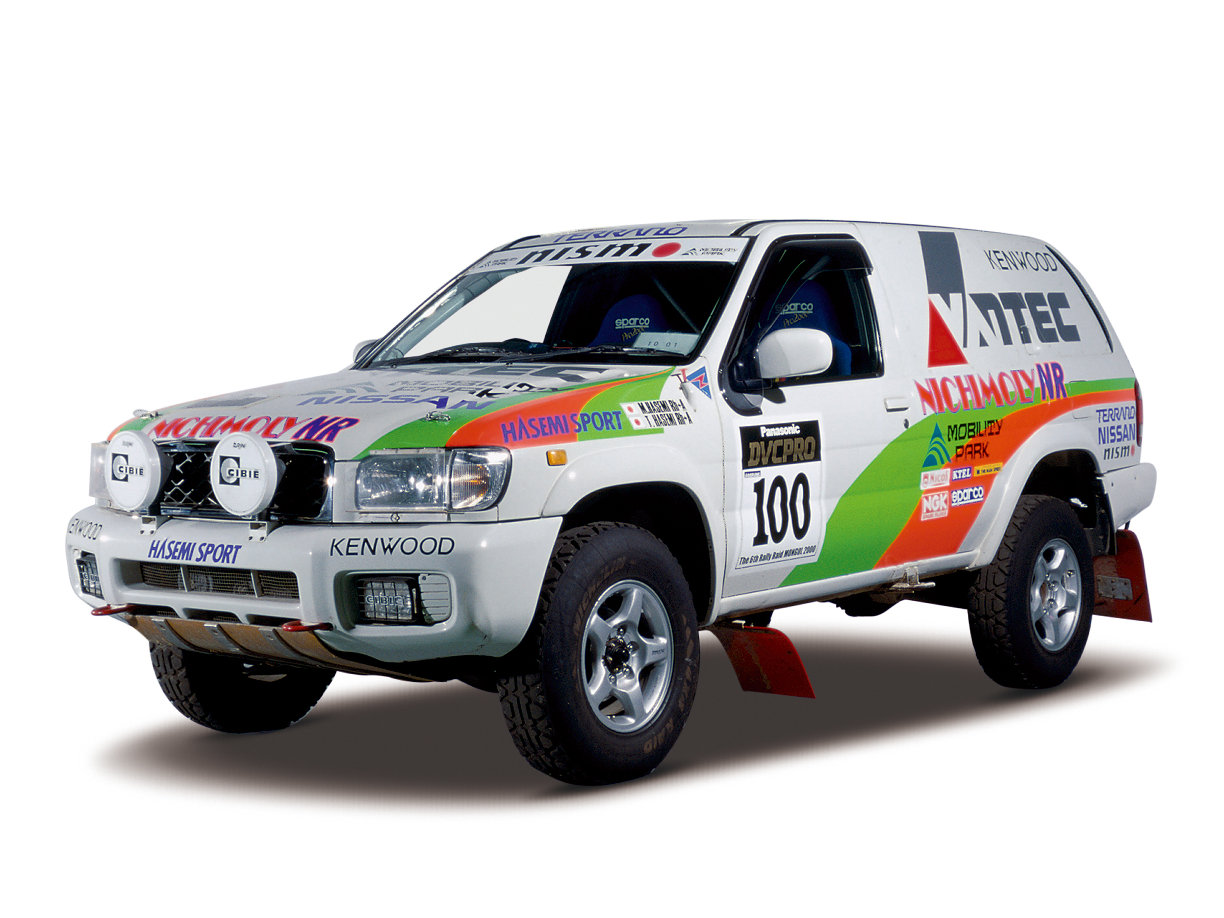 市販乗用車をベースにしたマシンで、「ラリーの日産」と称される黄金時代を築くばかりではなく、SUV型の車両で挑むラリーにも日産自動車は積極的に参戦してきました。このテラノは、1995年(平成7年)に誕生した2代目モデル(R50型系)をベースに、2000年(平成12年)に開催された第6回ラリーレイド・モンゴルに参戦。エンジンは最高出力175馬力を発生するV型6気筒OHC・3,274ccのVG33E型を搭載。サーキットで輝かしい成績を誇る長谷見昌弘選手と長男の長谷見智之組で出場し、首都ウランバートルを起点に、3,583km以上にもおよぶコースが設定されたラリーにて、2位のマシンに4時間もの大差をつけて2年連続の総合優勝とTIクラス(市販ガソリン車無改造)優勝の栄冠を手にしました。