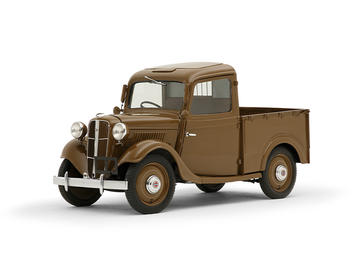 日産のピックアップトラックは、1932年、前身のダット自動車製造が発売したダットサン10型の時代から存在したといわれ、グローバルに見ても日産最古の車種として80年以上の歴史を刻んでいます。少しでも多くのお客さまのニーズに応えるため、日産は創業初期から商用車にも力を注いできたのです。ダットサントラック17T型は、15T型(1936年発売)の後を受けて1938年に登場し、17型の乗用車と同様、サイドバルブの722ccエンジンを搭載していました。、戦時色が濃くなる1937年(昭和12年)以降は、ガソリン節約のため、国民車として燃費の良いダットサンの使用が奨められる時代となり、ダットサントラックも商店やデパートへの小口配送に広く活躍しました。