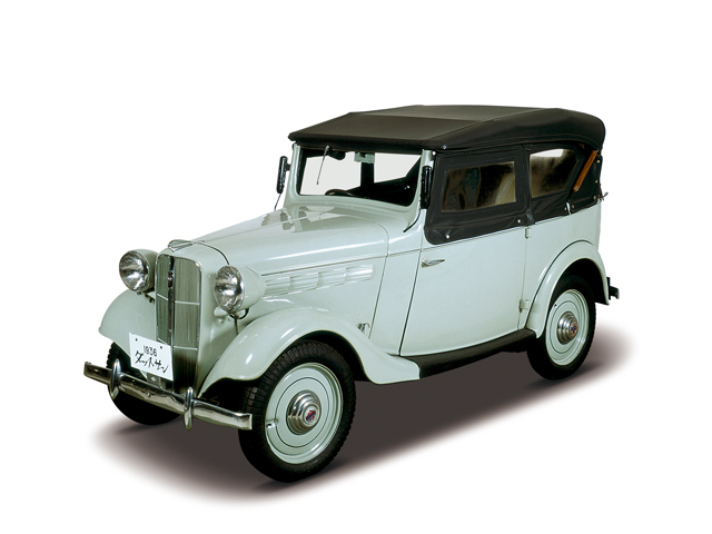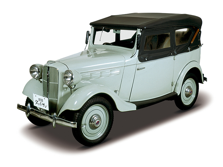 1936年(昭和11年)5月に登場したダットサン15型フェートンです。フェートンとは、4人乗りセダンを幌付きにした仕様です。搭載エンジンは1935年に登場した14型と同じ722cc(7型)で、排気量こそ同じですが、圧縮比を5.2から5.4に上げることで、16馬力と1馬力向上させています。現在でこそクルマにとって1馬力は大きなパワーアップには感じられないかもしれませんが、当時では着実な進化といえるものです。エクステリアでは、ラジエーターグリルの左上に角型のDATSUNバッジが付いたのが15型の特徴ですが、このクルマでは残念ながら欠品となっています。さらに、ボンネット真横にあるルーバーのデザインも14型のシンプルな縦縞のものから、5つ連なるような横長形状のデザインに変わっています。