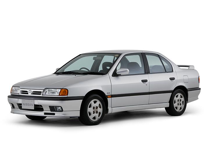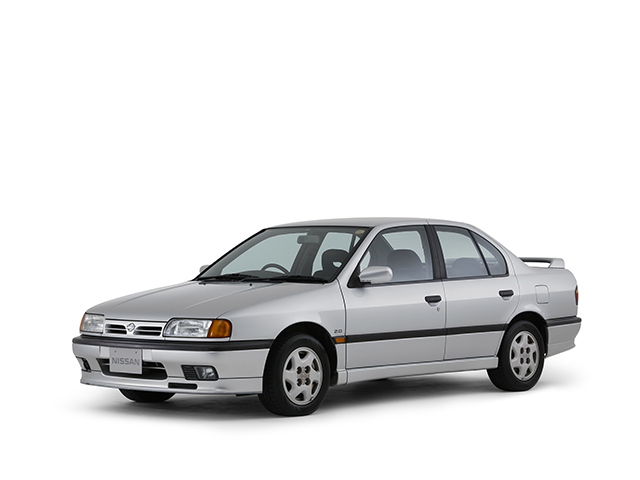 1990年2月、欧州の名車に匹敵する走りの性能と快適性を実現した新たなコンセプトのセダンとして登場したのが、初代プリメーラP10型です。「90年に世界一の動性能を実現しよう」を合言葉に開発を続けた901活動から生まれた前輪マルチリンクサスペンションによるハンドリング、広い室内、大容量でなおかつ大きく開くトランクなど、正統派セダンにふさわしい性能が与えられました。車両のパッケージングのよさを直接訴求した「プリメーラ・パッケージ」のキャッチコピーも話題になりました。このクルマは、P10の最終型で、2.0TmのSセレクションにオプションのフルエアロスポイラーパッケージを装備したホットな仕様です