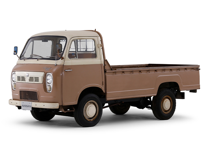 1957(昭和32)年、国産初の本格的キャブオーバー型トラックとして誕生したのがC40型ニッサンジュニアキャブオールです。1.5ℓ・50psのエンジン出力は、翌1958(昭和33)年には57psへ向上して型式がC42型になり、1959(昭和34)年には3人乗りのC43型に進化。1960(昭和35)年には、71psと大幅に出力向上したC140型となりました。1962(昭和37)年にエンジンが1.9ℓに拡大され85psとなって型式がC141型となり、1963(昭和38)年にはヘッドランプとウインカーが一体となった新デザインへ移行します。4610mmの全長ながら、小型車並みの最少回転半径(5.3m)による取り回し性能、クラス唯一のトーションバー式スタピライザーによる乗り心地の良さなどが好評でした。このクルマは1963年のC141型です。