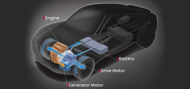 Equipped with an EV-technology-based series hybrid system—Pure Drive e-Power—, the Nissan Gripz Concept delivers a smooth, refined and exhilarating driving experience with outstanding fuel efficiency. Within the system, an efficient gasoline engine powers the same electric motor used in the Nissan Leaf.