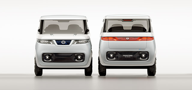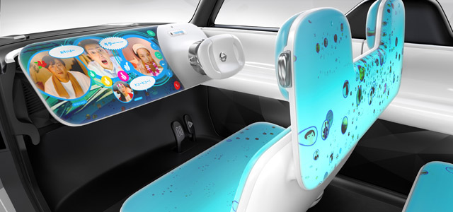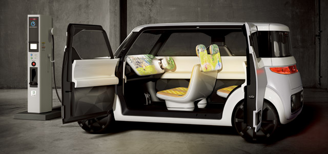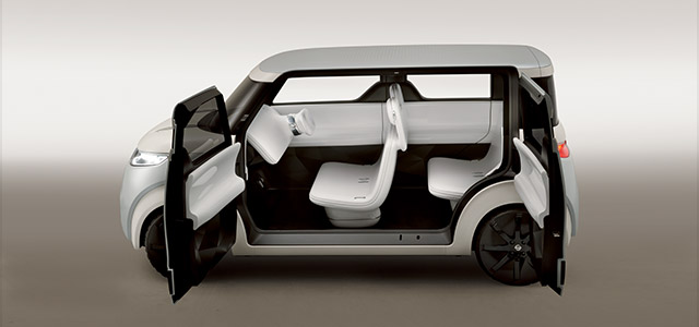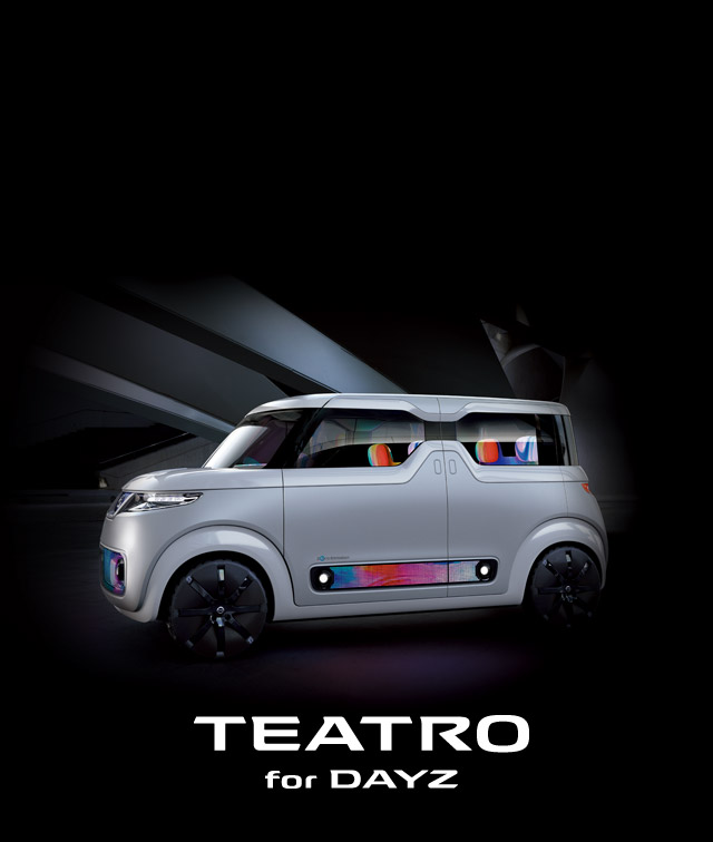 Connecting with friends and sharing experiences. This is what life is all about for the generation that will reach driving age in a few years. Nissan calls this generation share natives. And we have a created an innovative concept especially for them: Teatro for Dayz. The minimalist interior is a canvas for the share natives' imagination. White seats and flat surfaces can display video and images. Games can be played on the instrument panel. With its high-capacity battery, this EV minicar is like a digital gadget,