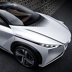 完全自動運転の実現により“ぶつかる”ことから解放された「ニッサン IMx」は、 日本の伝統的な感性や美意識を表現したインテリアデザインにより、これまでに 味わったことのない開放的な空間デザインを表現。「和」の感性を取り入れた エクステリアデザインは日本ならではの感性や先進性との親和性を表現しています。