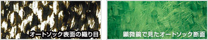 オートソックはポリエステル繊維を特殊な織り方で仕上げています。また表面は細い繊維が毛羽立った状態になっています。
