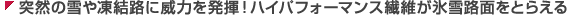 表面の繊維がこの水膜を吸収し、粗い目をもった特殊な織り方と細毛によって、摩擦を起こす面積を増やしグリップします。雪上ではさらに細毛が車両の重みによって、雪と一緒に踏み固められるため、グリップ力を増加します。