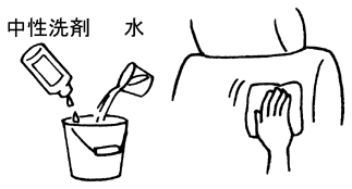中性洗剤を薄めて柔らかい布に含ませ、軽くふき取ります。さらに水に浸した布を固くしぼってふき取ります。