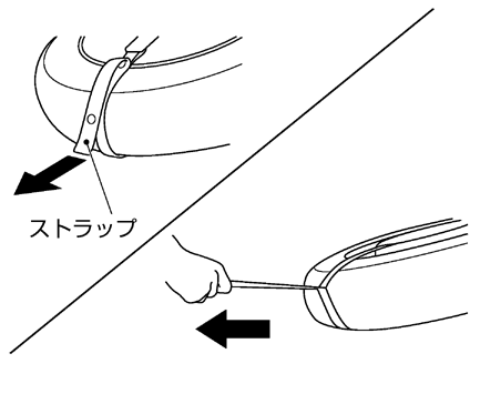 ジャッキアップ中は車両の下に体を入れないように、必ずストラップを使って引き出してください。