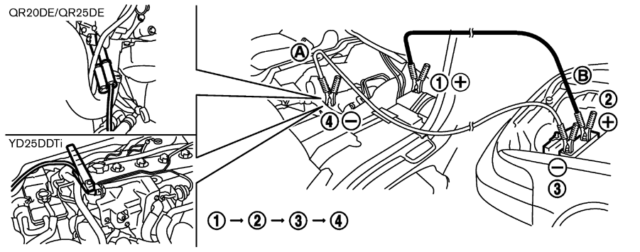 ブースターケーブルを自車(A)のバッテリーの⊖端子に直接つながない。