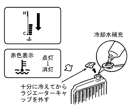 走行中、再度高水温警告灯が点灯するか、水温計がオーバーヒートの範囲を示したときは、1~4の作業を繰り返し行ってください。