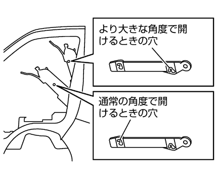 整備などでエンジンカバーをより大きな角度で開けたいときは、エンジンカバーのフックを吊りひもの根元の穴に固定します。