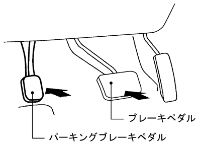 パーキングブレーキをかけるときは、右足でブレーキペダルを踏みながら、左足でパーキングブレーキペダルをいっぱいに踏み込みます。