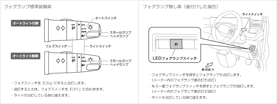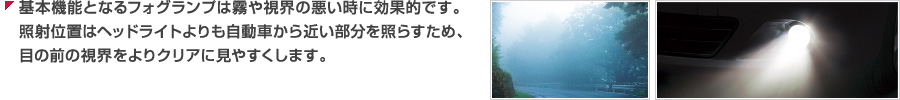 基本機能となるフォグランプは霧や視界の悪い時に効果的です。照射位置はヘッドライトよりも自動車から近い部分を照らすため、目の前の視界をよりクリアに見やすくします。