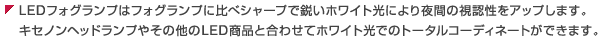 LEDフォグランプはフォグランプに比べシャープで鋭いホワイト光により夜間の視認性をアップします。キセノンヘッドランプやその他のLED商品と合わせてホワイト光でのトータルコーディネートができます。