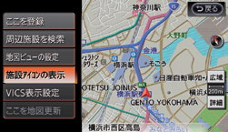 地図上にガソリンスタンド、コンビニ、駐車場などの施設アイコンを表示できます。