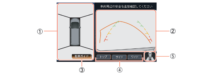 トップもしくはサイドを選ぶと、左画面が選択したビューに切り替わります。ワイドを選ぶと、ワイドビュー画面が表示されます。