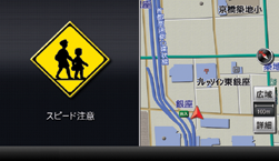 小学校付近走行中に、速度、ブレーキ・アクセルの状態に応じて画面表示と音声でガイドします。