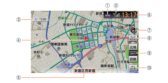 地図の北方向を示します。タッチすると、地図の方向を変えることができます。(スタンダードビュー時のみ)