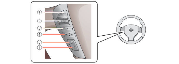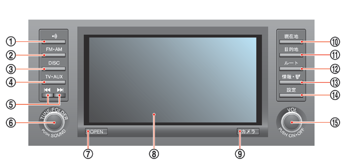 押すごとにiPod/USB → CD/DVD → ミュージックボックス → Bluetooth®オーディオに切り替えます。