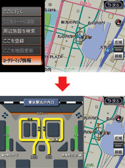 縮尺が50m~1kmのスタンダードビューで表示できます。ロータリーマップが表示可能な場所にはロータリーマーク(