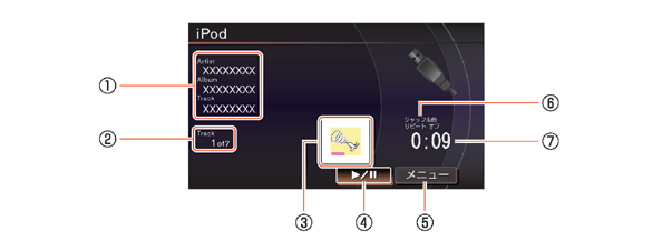 曲情報が登録されているときは、アーティスト名/アルバム名/曲名を表示します。また、Podcast再生中はアーティスト名の代わりにリリース日を表示します。