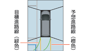 予想進路線(橙色)と目標進路線(緑色)が重なるように停車させた状態でハンドルを操作します。