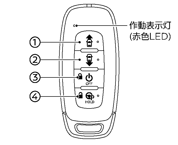 プロパイロット リモート パーキングが非作動時、短押しすることで全ドアを解錠するのに使用します。また長押しすることでプロパイロット リモート パーキングを起動させるのに使用します。そのあとEVシステムが立ち上がると、プロパイロット リモート パーキングは作動中になります。