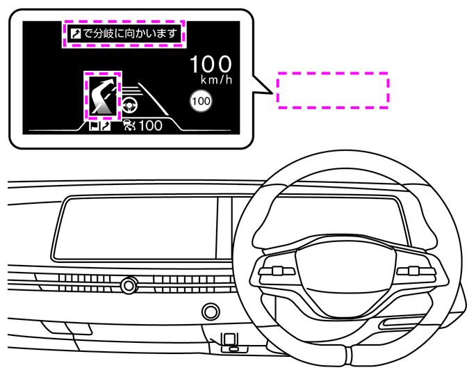 運転者がナビゲーションシステムで目的地を設定している場合、ナビゲーションのルートに従って走行するために必要な車線変更地点に到達すると、表示により運転者に車線変更を提案します。