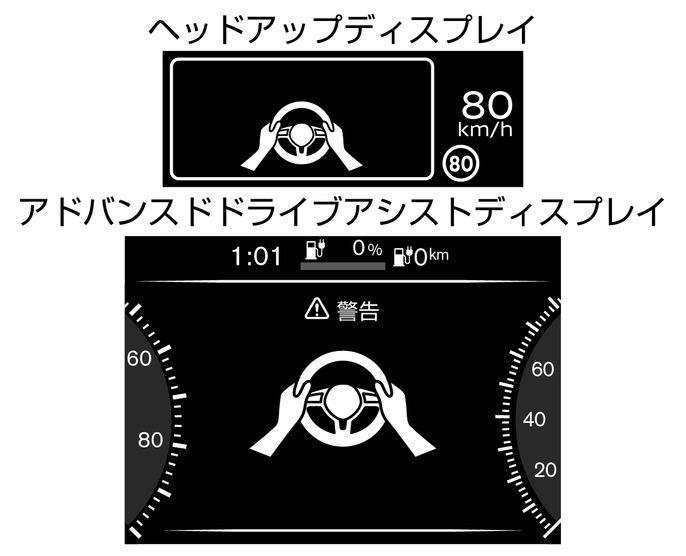 運転者のハンドル操作がない状態が継続すると、緊急警報音が鳴るとともにヘッドアップディスプレイ、およびアドバンスドドライブアシストディスプレイに「減速します」と表示され、自車を減速、緊急停止させます。