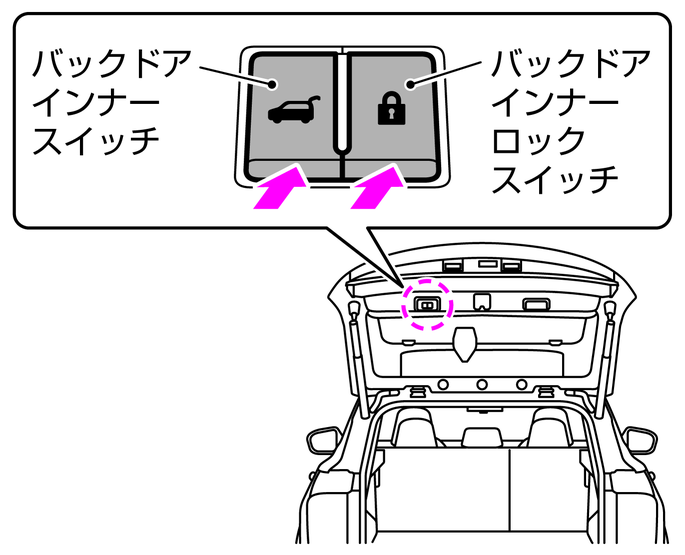 バックドアインナーロックスイッチを押すと、全ドアが施錠されバックドアが全閉します。全閉したあとブザーが1回鳴り、非常点滅表示灯が1回点滅します。