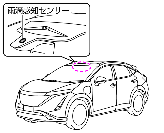 パワースイッチがONでスイッチ位置を AUTOにしているとき、雨滴感知センサー上部のフロントガラスに手で触れたり、水分を含んだ布などを近づけたりしない。